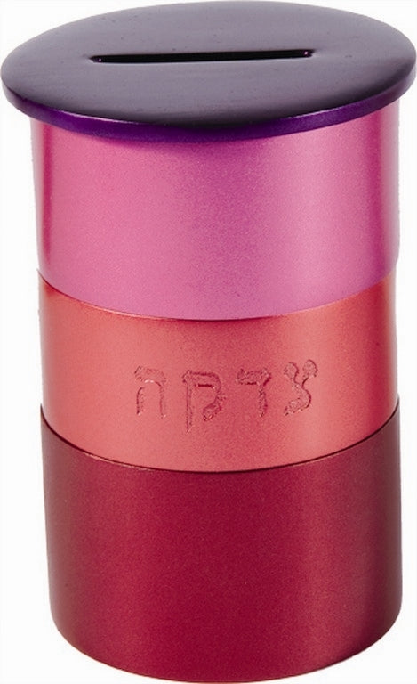 Yair Emanuel tzadakah box will inspire charitableness, sparking within children the desire to help others and do good deeds. The tzadakah box is crafted out of stacked, anodized aluminum rings of variant shades.